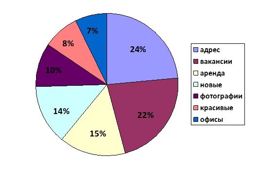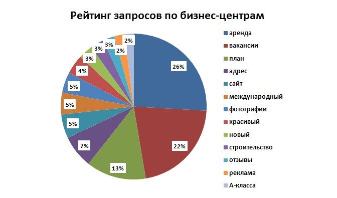 Всё так же пользователей интересует стандартная справочная информация о бизнес-центрах, например, вакансии, адреса, фотографии, план здания, отзывы. Новым веянием можно назвать запрос «сайт бизнес-центра» (37). В осеннем сезоне такой контекст даже не фигурировал.