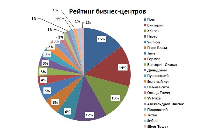 По итогам полученных результатов, благодаря системе Ядндекс.Вордстат, мы составили рейтинг самых популярных, по мнению пользователей из Минска и области, бизнес-центров в декабре. При анализе запросов возник небольшой нюанс: наименования «Плаза / Plaza» и «Тауэр / Tower» являются составной частью сразу нескольких названий бизнес-центров, например, «Виктория Плаза» и «Роял Плаза». Потому данные запросы не учитывались при подсчётах, чтобы рейтинг получился максимально точным и честным. Таким образом, декабрьский топ–20 бизнес-центров выглядит следующим образом.