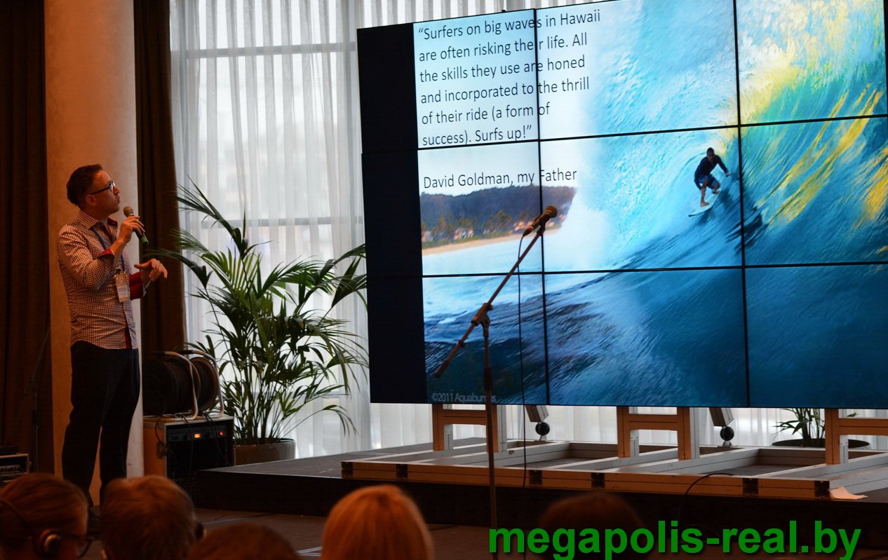 Итак, обратимся за вдохновением к первому дню. После официального открытия на сцену пригласили первого спикера c четырёхлетним опытом работы в «НАСА» – Майкла Голдмана, который выступил перед публикой с невероятно эмоциональным и душевным докладом «How to win in jobs, relationships and parenthood: my 39 year journey to living life grounded, happy, inspired and successful». Порой даже микрофон не выдерживал такого громкого во всех смыслах выступления.