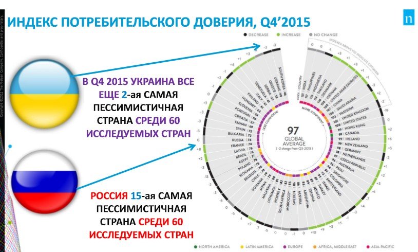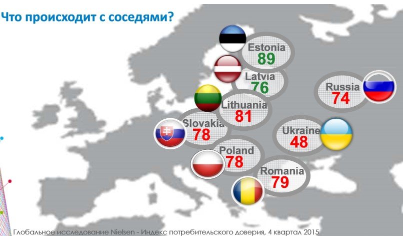 Ежеквартально в 60-ти странах мира мы измеряем индекс потребительского доверия. Уверен ли покупатель в завтрашнем дне, насколько сейчас удачное время для покупок, как обстоят дела с его финансовым положением и т.д. По результатам 2015 года Украина занимает второе место среди самых пессимистично настроенных стран, Россия – пятнадцатое место. Очень приятная новость, что с 2016 года и Беларусь включена в данное исследование, и совсем скоро появятся первые результаты. Для сравнения, у наших балтийских соседей результаты гораздо более оптимистичные, особенно в Эстонии и Латвии.