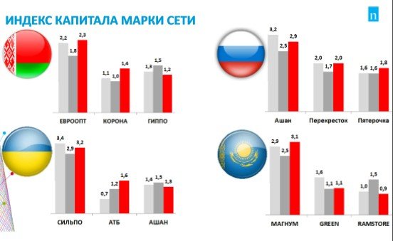Обратим внимание на индекс капитала марки сети. В Беларуси сегодня лидерство принадлежит «Евроопту», «Короне» и «ГИППО». В условиях повышенной конкуренции большое значение имеет сила брэнда, а также те отличительные характеристики, которые он использует в своей промо-продукции.