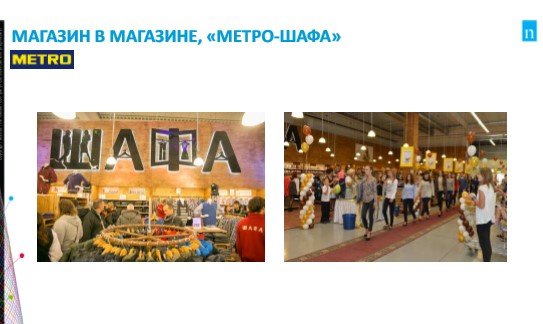 Одним из выигрышных решений сегодня является предложение нового формата. Например, в Украине организовали магазин в магазине «Метро-Шафа», где внутренний интерьер отображает концепцию стандартного квартирного шкафа, что вызвало большой интерес у покупателей. Или интересная акция «Опт для всех», суть которой в том, что оптовая цена включается на покупку трёх единиц определённого товара.