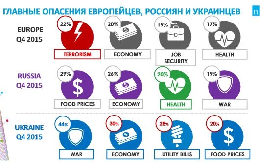 Обратим внимание на главные опасения европейцев, россиян и украинцев. В связи с недавними печальными событиями в Брюсселе, Европу особенно остро волнует вопрос терроризма, большой поток мигрантов вызывает большой интерес к экономике, отсюда волнение за сохранность рабочего места. В России каждого третьего сегодня беспокоят хорошие цены на продукты питания, каждого четвёртого интересует, куда катится экономика и что с ней будет. В Украине с 2014 года традиционно всех жителей интересует война (44%), волнения также связаны с экономической ситуацией и размером оплаты коммунальных услуг, ведь в данный момент схема их подсчёты выстраивается согласно европейскому образцу.