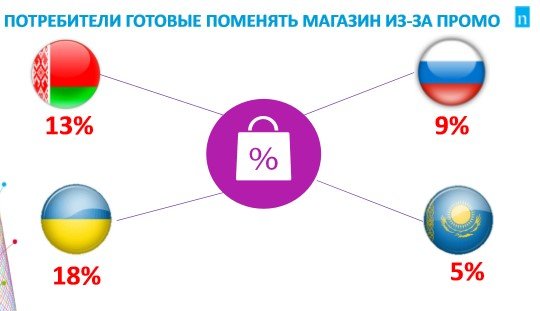 Рост цен по многом меняет поведение потребителей. И мы решили оценить желание покупателя менять торговые точки для покупок, если они увидели какое-то выгодное предложение в промо-продукции. Самый низкий показатель в Казахстане (всего 5%), а самый высокий в Украине (18%). В Беларуси 13% опрошенных готовы сменить магазин для шопинга после просмотра рекламы.