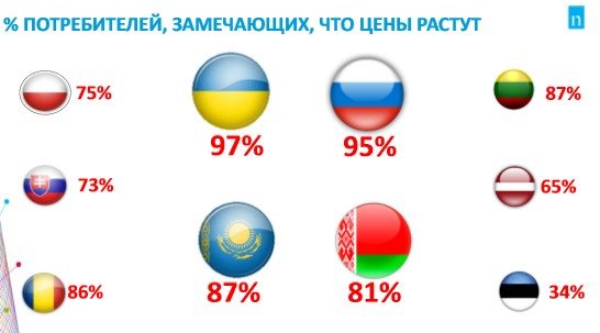 С чем связаны все эти волнения? Конечно, с девальвацией и инфляцией в наших странах. Впервые в истории Украины отмечается такой высокий уровень инфляции, обогнали даже Сирию по данному показателю (43,3%). Логично, что такая ситуация повлияла на цены, поэтому наши специалисты стали задавать потребителям вопрос, замечают ли они рост цен? На Украине 97% респондентов ответили положительно, в России – 95%, в Казахстане – 87%, в Беларуси – 81%. Например, у западных соседей около 50% покупателей не то что не заметили повышения цен, а даже считают, что они понизились. И это не шутка, а факт.