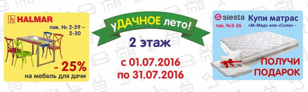 Вы можете принять участие в акции «Удачное лето» и приобрести мебель для дачи со скидкой 25%, а при покупке матраса Siesta «М-Мед» или «Соло» - получить в подарок одеяло и подушку.