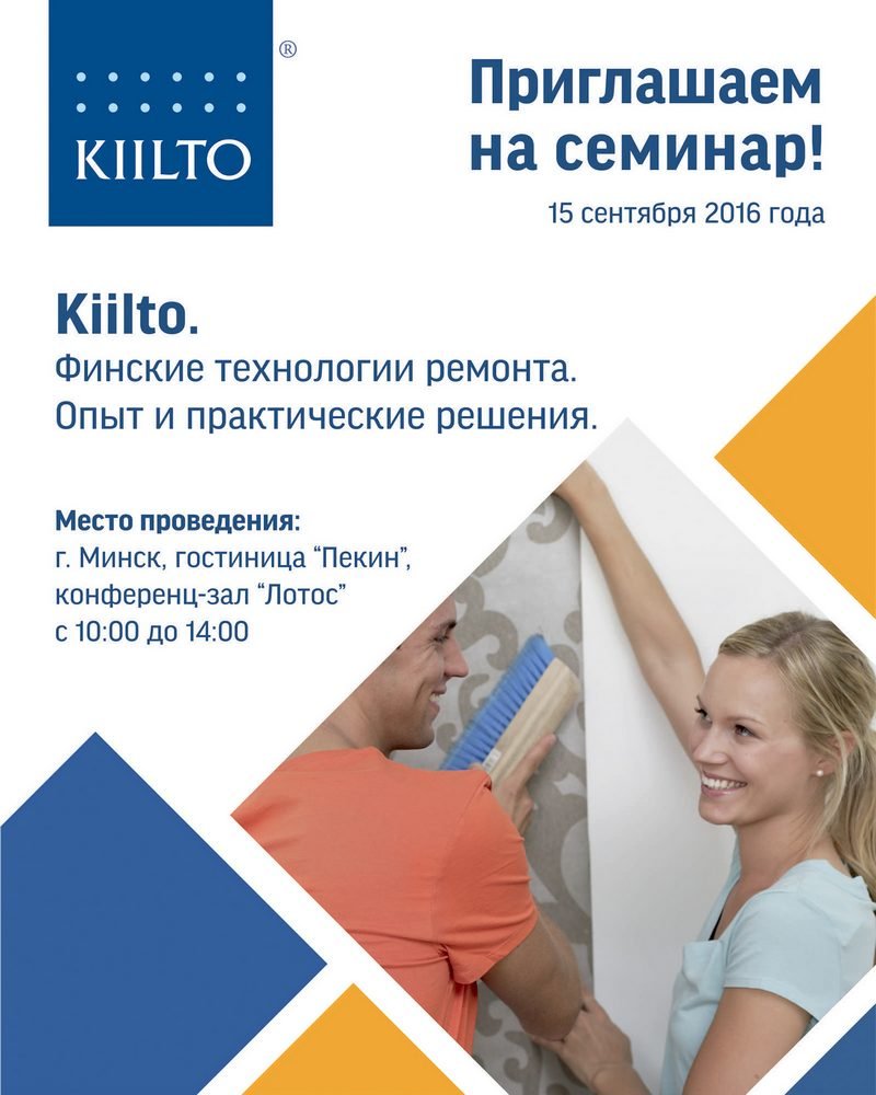15 сентября 2016 года «Медиагруппа «АРТ Престиж» совместно с ИООО «Киилто Клей» приглашает вас стать участником актуального семинара «Kiilto. Финские технологии ремонта. Опыт и практические решения».