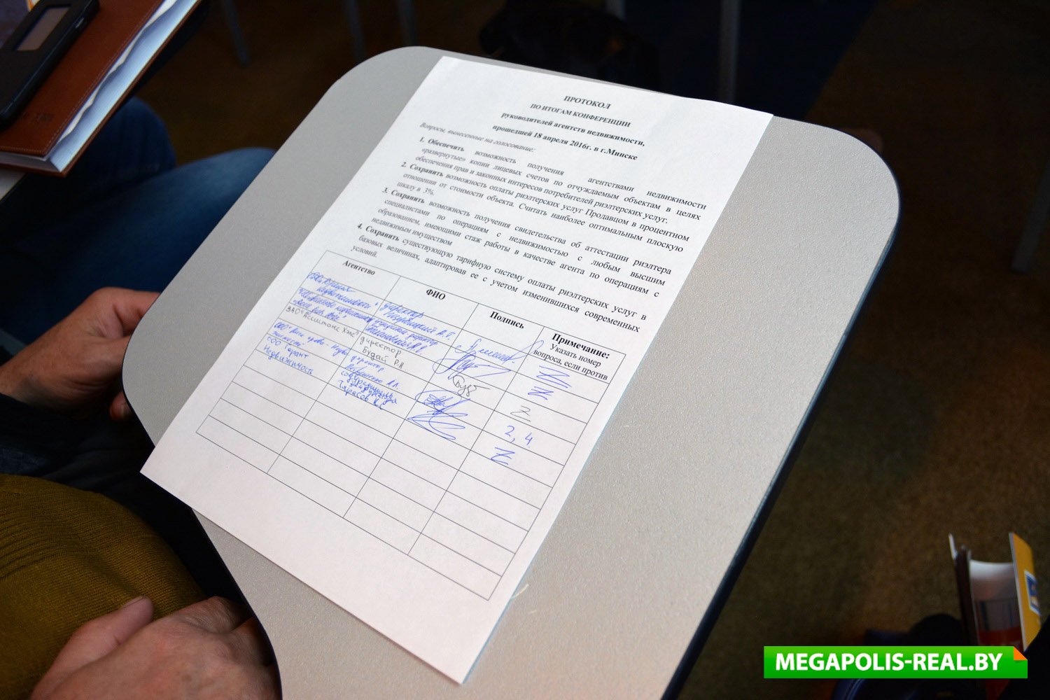 Очень важным моментом конференции стало проведение голосований по наиболее актуальным вопросам риэлтерской деятельности: проект изменений в Указ Президента РБ №15, оплата риэлтерских услуг в процентном отношении, предлагаемые изменения тарифов и т.д. Участники могли не только проголосовать, подняв руки, но и запротоколировать своё мнение, поставив подпись на специально приготовленных организаторами бланках. Далее риэлтерское сообщество обсудит мнение большинства с органами государственного правления, чтобы прийти к неким компромиссным решениям по наиболее важным моментам.