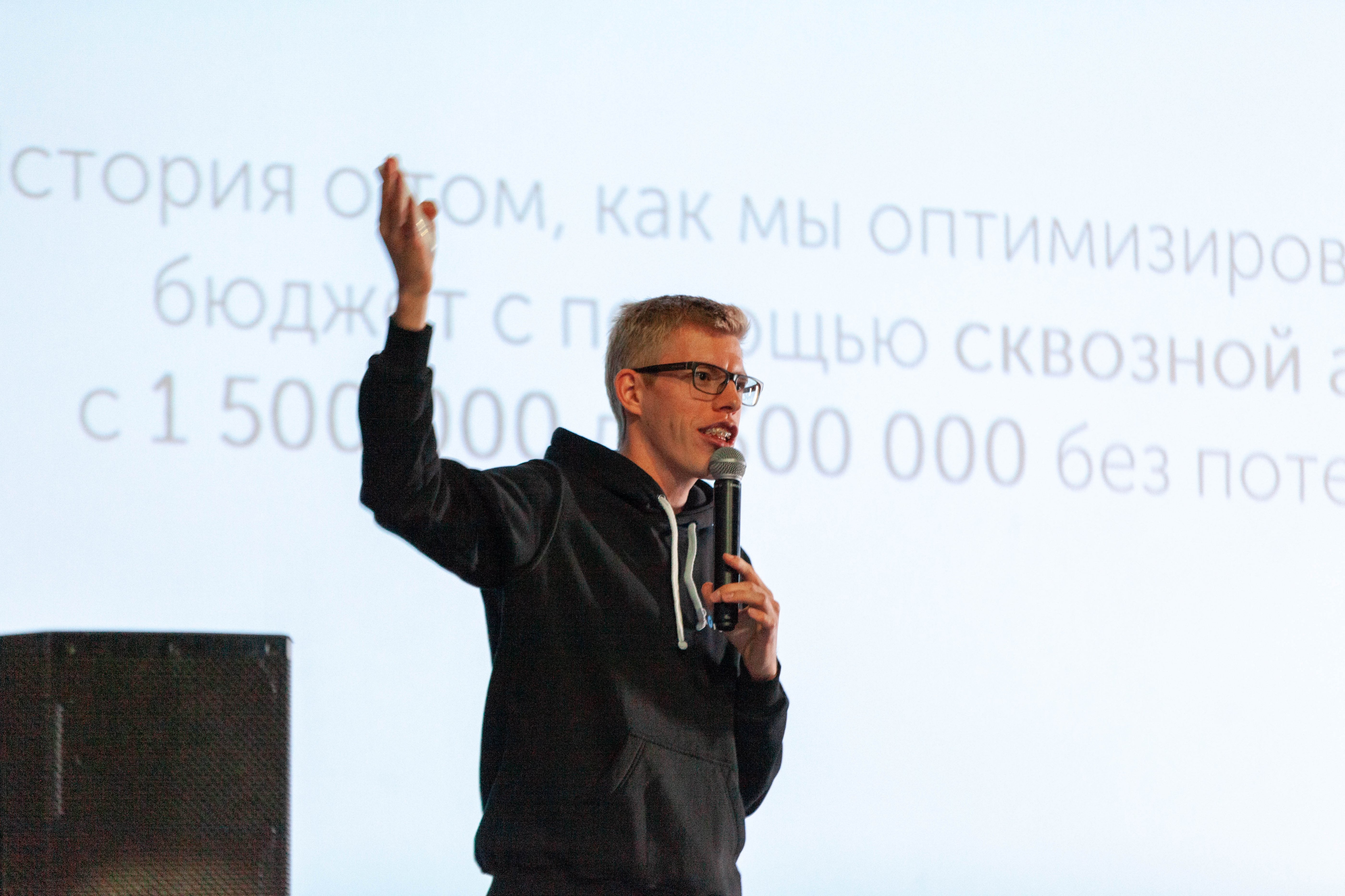 Следующим выступил Герман Гаврилов, создатель Roistat — системы, которая связывает данные по реальным продажам из 1C и CRM с данными из рекламных источников Яндекс.Директ и Google AdWords. Герман ответил аудитории на вопрос “Как расти с помощью сквозной аналитики?”.