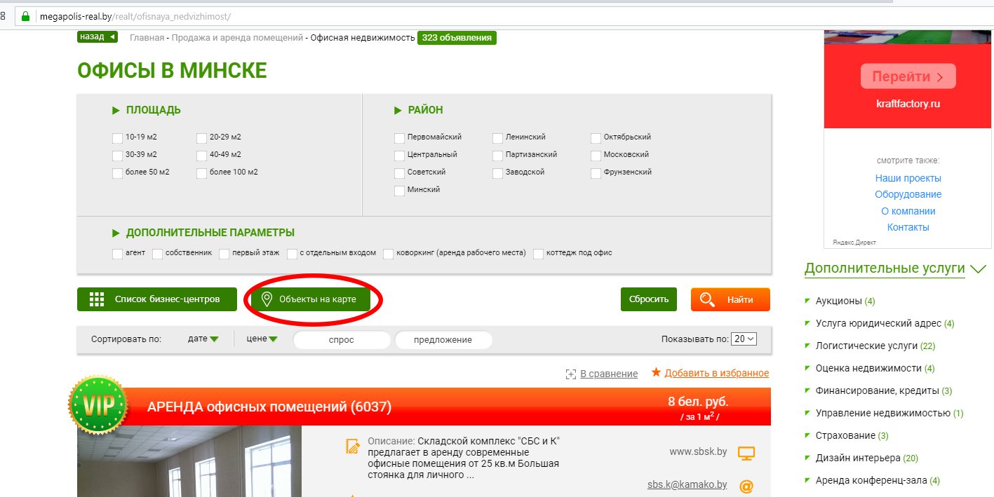 Возможность выбора по параметрам в режиме карты полностью сохраняется: работают фильтры поиска по площади помещения, району города и т.д.. Изменить регион поиска по Беларуси также можно непосредственно на странице с картой.