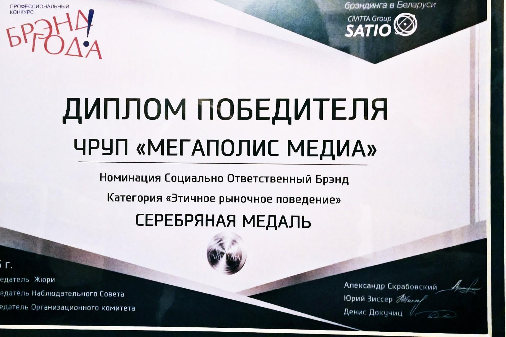 Нам очень приятно, что деятельность портала коммерческой недвижимости MEGAPOLIS-REAL.BY была высоко оценена компетентным жюри. В нашем офисе видное место теперь занимает диплом победителя конкурса "Бренд года" в категории «Этичное рыночное поведение» в рамках номинации «Социально ответственный бренд», серебряная медаль.