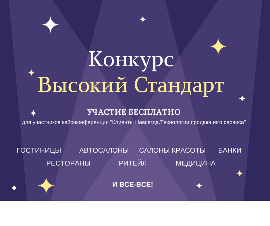 А тех, кто гордится сервисом в своей компании и готов побороться за звание лучшего, мы приглашаем принять участие в конкурсе «Высокий стандарт». Для участников конференции участие в конкурсе БЕСПЛАТНО. Компания Audit Service проведет анализ Вашего сервиса методом Тайный Покупатель и даст ряд рекомендаций по повышению уровня сервиса в Вашей компании, а лучших ждут призы и упоминание в СМИ.