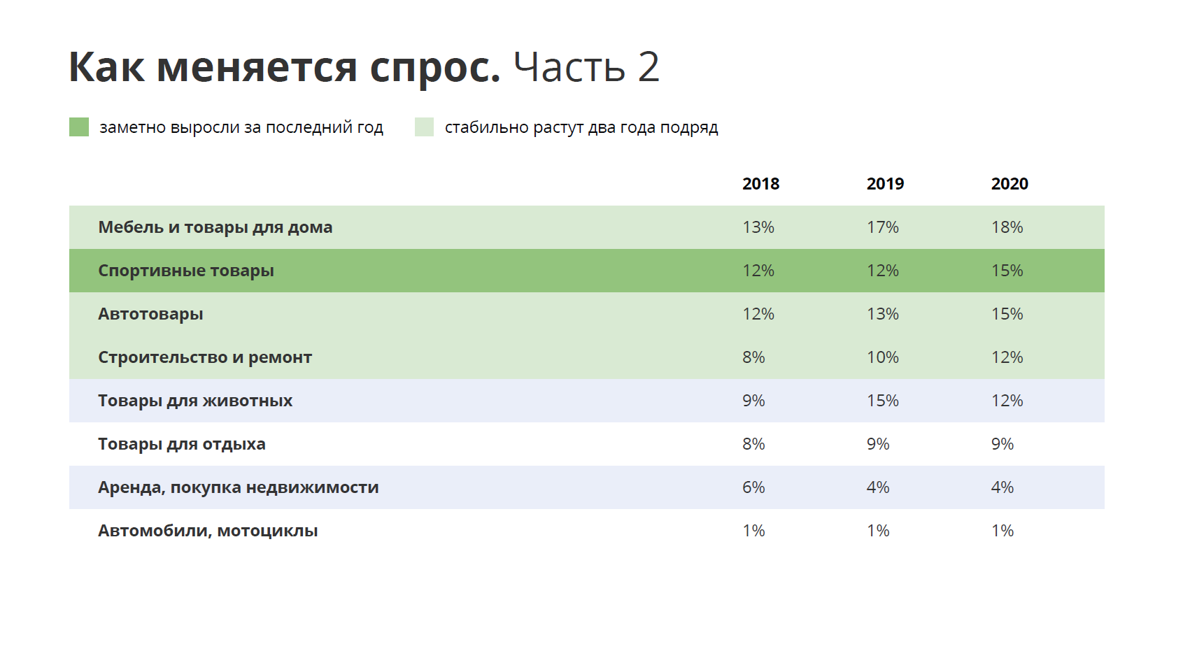 Сильнее всего за последний год в интернете вырос спрос на технику и электронику, средства ухода за собой, доставку готовой еды и спортивные товары. Все больше людей заказывают онлайн мебель и товары для дома, автотовары и материалы для строительства и ремонта — количество людей, покупающих эти категории в интернете, стабильно растет три года подряд.