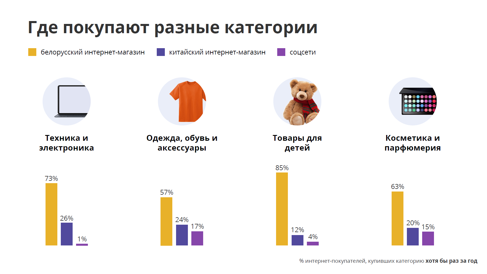 Большинство белорусов покупают в интернете технику и электронику, одежду, обувь и аксессуары, косметику и парфюмерию, доставку готовой еды и товары для детей.